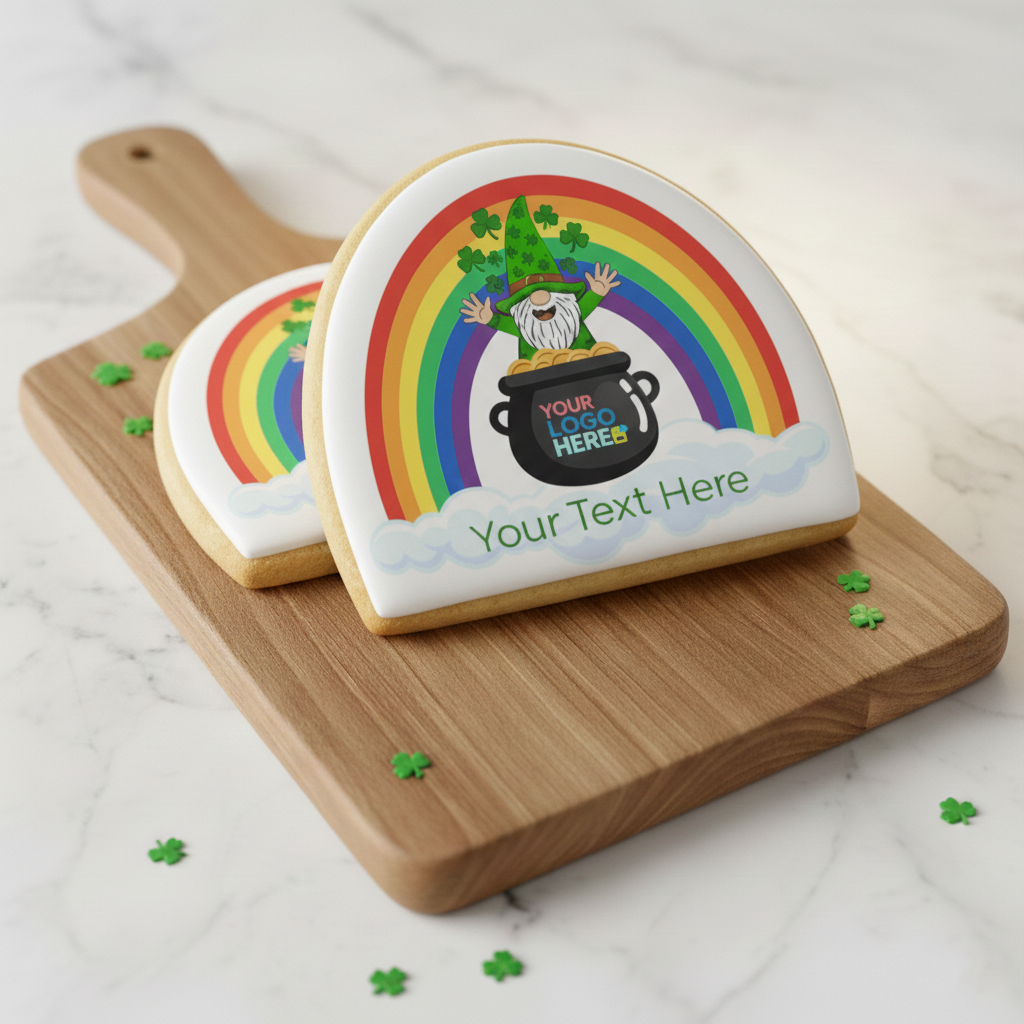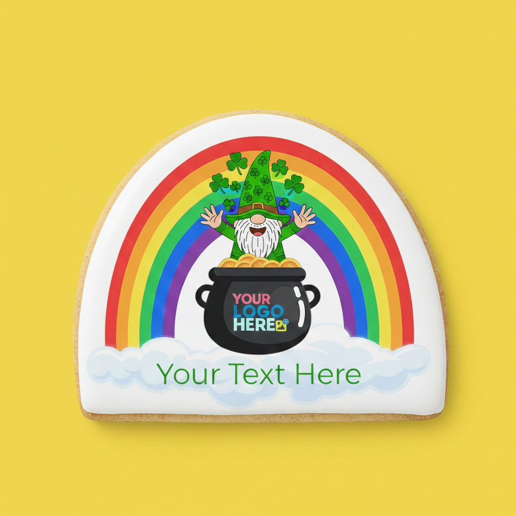 This bold, arched sugar cookie features a cheerful gnome popping out of a pot of gold, framed by a vibrant rainbow. With space for your logo on the cauldron and a custom message in the clouds, it’s a high-impact treat that’s sure to be the talk of the party.
