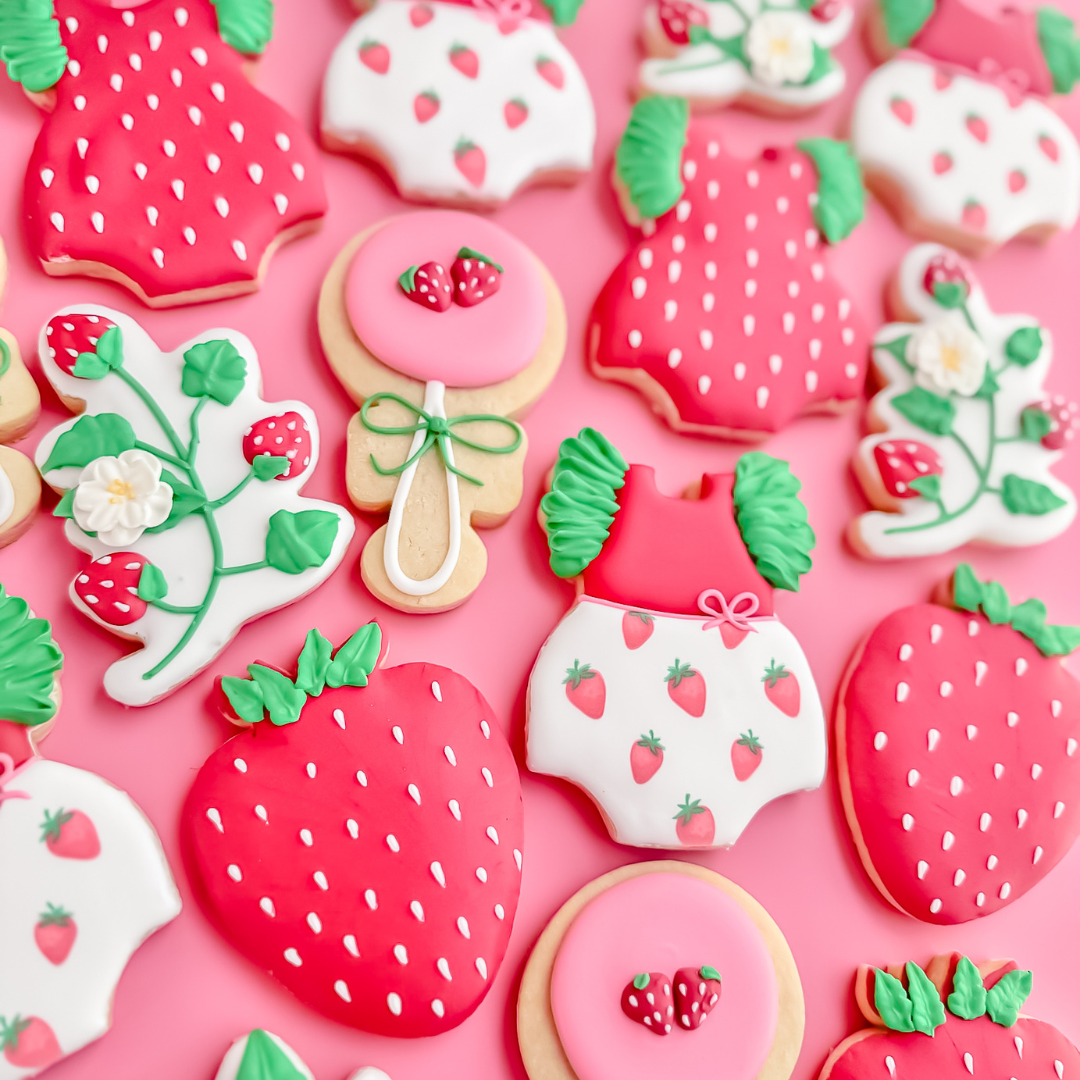 This charming set is overflowing with hand-decorated sugar cookies, featuring a gorgeous mix of designs. You'll find ripe, juicy strawberry shapes, adorable onesie/dress cookies dotted with tiny berries, whimsical floral vines with delicate white blossoms, and sweet strawberry lollipop accents.